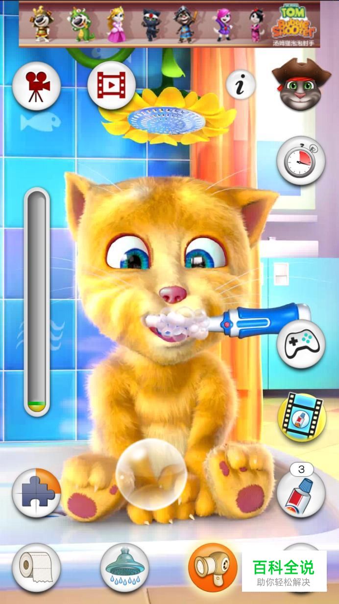 第四个图标是一个牙刷哦,点击这个图标就可以给金杰猫刷牙啦。这个需要手动刷牙哦,就像我们平时刷牙一样。当下图一左边的条框满了,就代表金杰猫的牙齿刷干净啦,如图二。