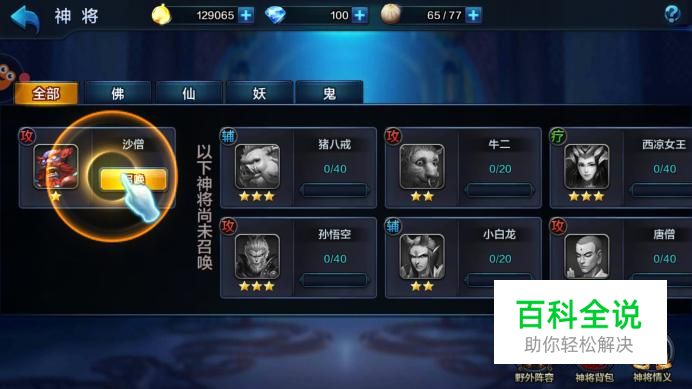 进入神将信息界面,例如下图沙僧需要收集10个碎片,在左侧可查看技能信息,点击“召唤”,消耗想爱你供应的金币。