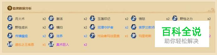 打法分析:起手就是找成长,激活等涨费用的牌,快速跳科技,尽快使用终极感染补充手牌,面对铺场职业可以使用传播瘟疫拖住节奏,由于不缺手牌,可以在合适的时候下奥术巨人,最后的斩杀手段可以是大蓝龙+月火术+月火术的12点斩杀。