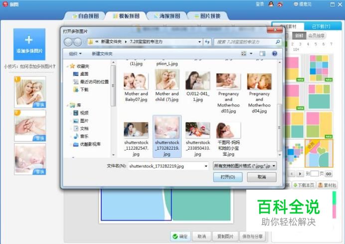 右侧是系统提供的素材,需要登录美图秀秀才可以下载在线素材,这里可以使用QQ登录。点击选择一个自己喜欢的模板拼图素材。