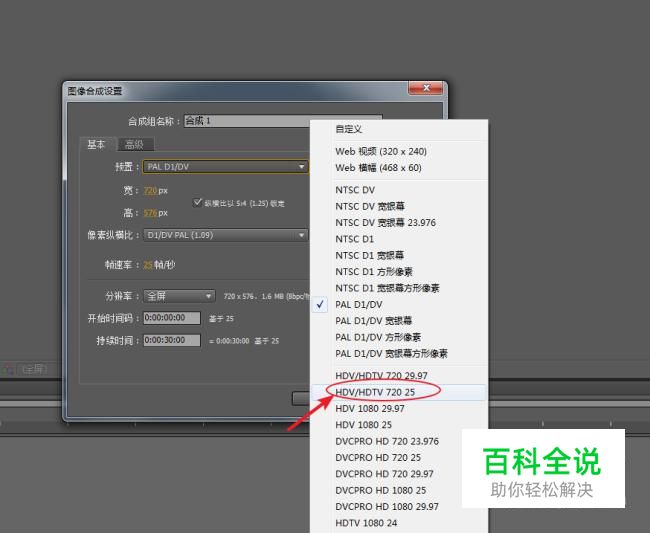 我们这里将预置选择HDTV(1280×720),确保帧数率为25/fps。