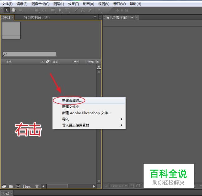 我们首先新建一个合成,在项目面板空白处右击选择新建合成组。