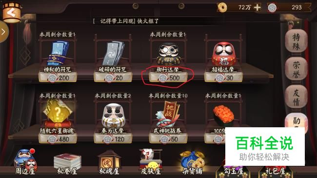 每周用500勋章兑换一个御行达摩。勋章在结界突破、狩猎战、逢魔之时、阴阳寮赠予碎片获得。