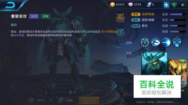 被动技能-兼爱非攻 承受敌方攻击的时候,释放技能可以形成护盾抵消部分伤害,第四次普攻有物理和法术两种加成以及击退效果,在血量充足的情况下要尽量打出这种被动效果造成伤害,击退敌人会有小团控的效果。
