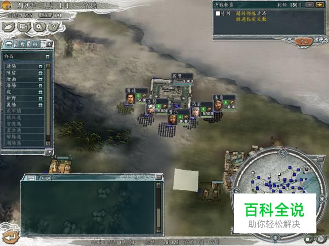 这一关我们操纵的是曹操这边的军队,消灭关羽或者撑过180天就算赢。先来看一眼我军的配置,曹仁,文聘,朱灵,满宠,贾逵,我只能说这是一群渣,也就曹仁,文聘有点战斗力,其他的好菜呀。