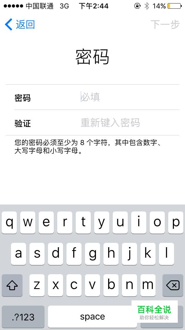 设置Apple ID密码(设置密码首字母需要大写)后点击“下一步”。