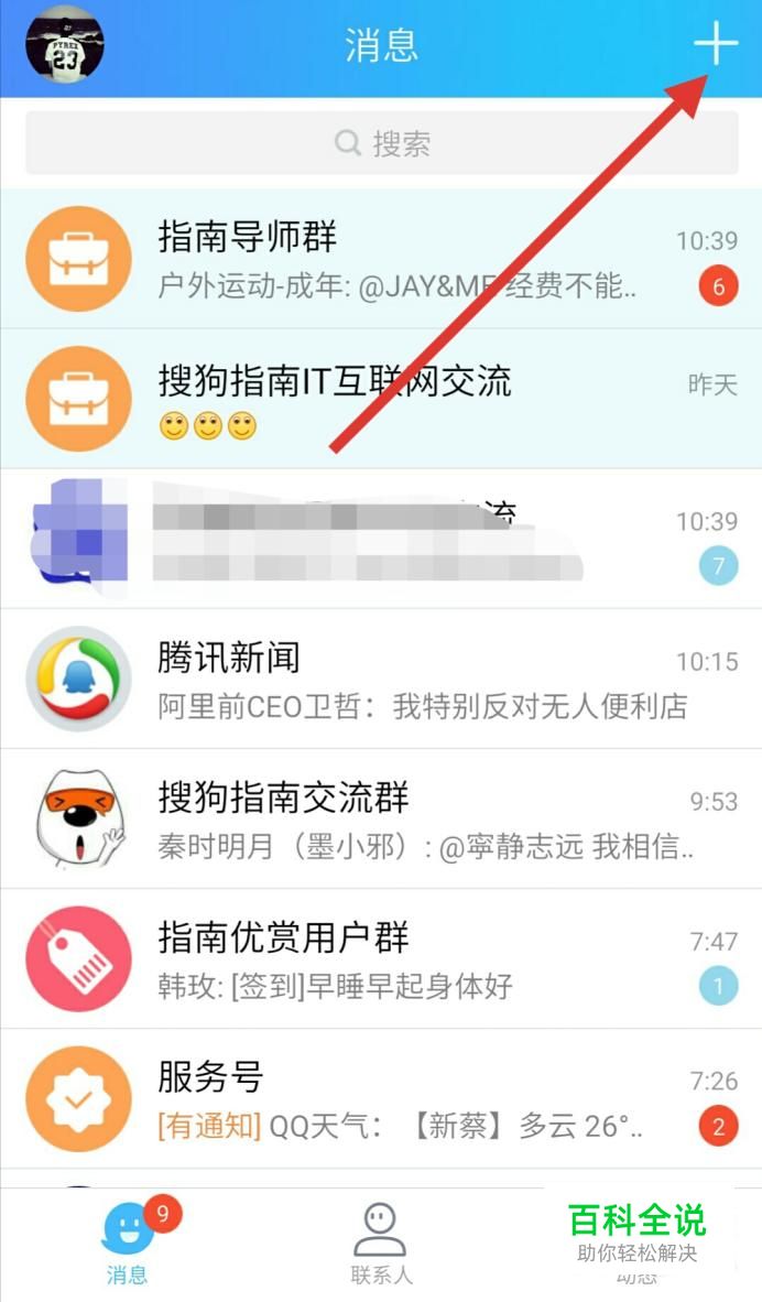 打开手机qq,在打开页面,点击右上角加号。