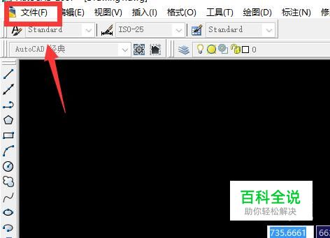 打开电脑中的CAD软件。在界面的上方有一排工具栏,其中有文件,编辑,视图,插入等等功能。点击第一个文件选项。