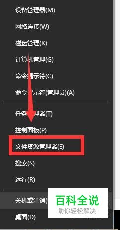 在这之前我们先要把所有的文件和文件夹都显示出来。右击开始菜单,点击列表中的文件资源管理器。