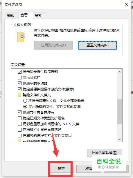 在面板中有一个高级设置,在下方有许多的选项。在里面找到隐藏文件和文件夹,勾选其中的显示隐藏的文件、文件夹和驱动器。