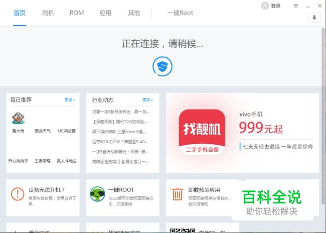 通过数据线将手机连接到电脑上后,打开刷机软件,手机就会自动连接到刷机软件上。