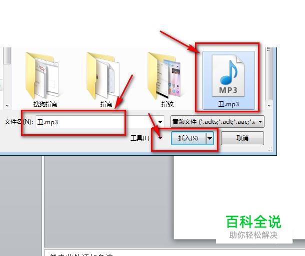 点击“文件中的音频”之后,就会弹出一个选择窗口,在这里我们找到要插入到PPT的音频文件之后,点击“插入”就OK了。