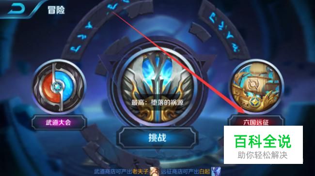 进入了冒险模式之后,我们可以在冒险模式界面下看到武道大会,挑战,六国远征。点击六国远征即可。