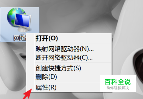 然后右键点击桌面上的‘网络’,或叫‘网络邻居’,不同的系统有不一样的叫法。打开右键菜单后点击‘属性’