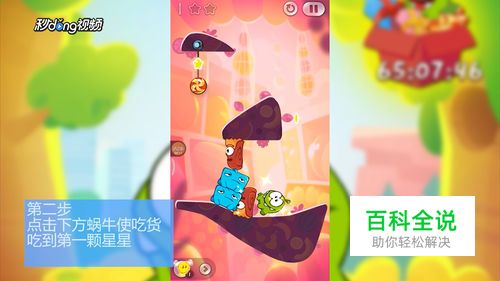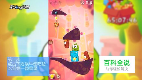 点击上方蜗牛割断绳子使糖果吃到第三颗星星并落入吃货口中。