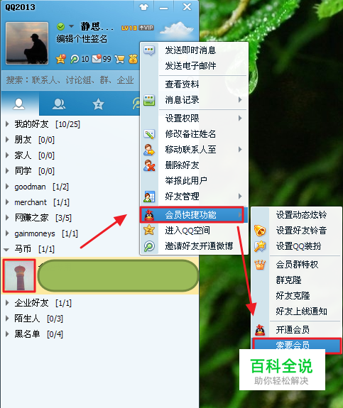 登录到您的QQ软件,在您的好友列表中,选择一位好友,点击鼠标右键,在弹出的快捷菜单中选择“会员快捷功能”和“索要会员”。