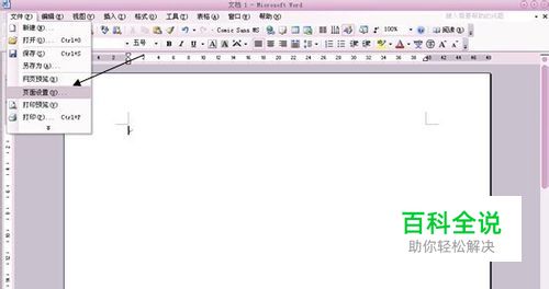 启动Word 2003,新建一个文档,点击菜单栏的“文件”,在下拉选项中选择“页面设置”如图所示。
