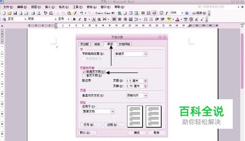 随即弹出一个“页面设置”对话框,把次对话框切换到“版式”,在“页眉页脚”中勾选“奇偶页不同”,如图所示。