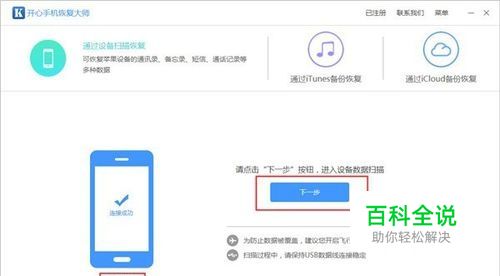 利用恢复软件的【通过设备扫描恢复】模式。这个模式的优点在于:即使之前没有利用iTunes备份过数据,也可以通过这个模式恢复我们想要的数据。连接完成后,点击下一步按钮,进入设备数据扫描。