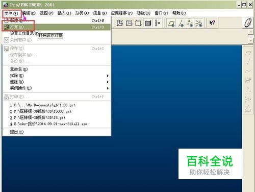 双击电脑屏幕中的图标,打开proe软件。然后在页面上选择【文件】中的【打开】命令。