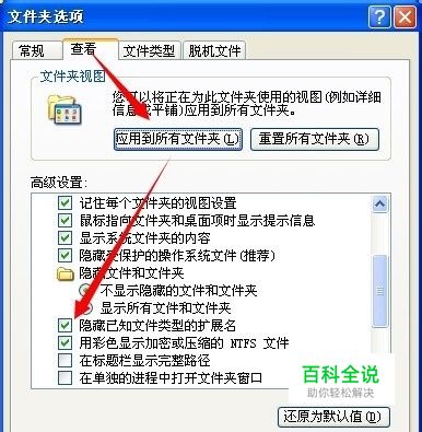 点查看——选应用到所有文件夹——取消隐藏文件类型扩展名
