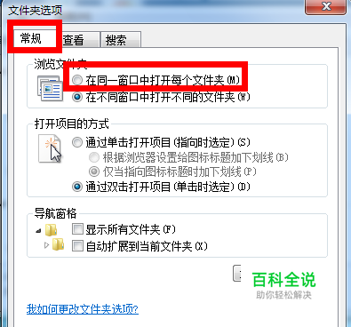 弹出“文件夹选项”窗口,选中“在同一个窗口打开每个文件夹”,点击确定