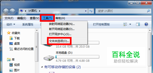打开“计算机”,找到菜单栏的“工具”,选择“文件夹选项”,如图