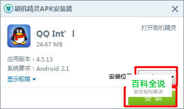 接着在弹出的“刷机精灵APK安装器”窗口中,将安装位置设置为“SD卡”,然后点击“安装”按钮。