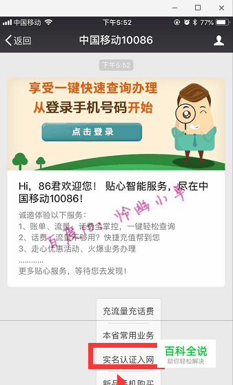 打开手机微信,关注微信公众号“中国移动10086”,选择“我要办理”→“实名认证入网”。