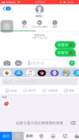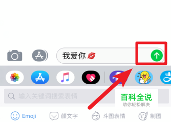 选择完毕后,在短信下方的文本框内输入“我爱你”,同时也可以加上emoji的嘴唇表情。然后,我们用指头长按后方的绿色发送键。