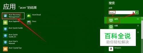 在应用搜索下输入你【ACER】就可以在左边找到【Acer Recovery Management】这个应用程序,点击进入。