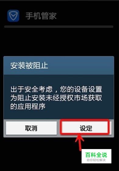 » 尝试安装『手机管家』,系统弹出『安装被阻止』的对话框; » 点击『设定』按钮。