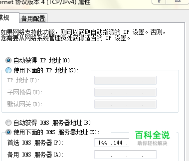 点击使用下面的DNS服务地址,在首选DNS服务器中 输入144.144.144.144,点击确定。