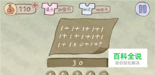 史小坑的爆笑生活第一关通关攻略:本关最大的难点就是要注意换行的地方,实际上就是1+1+1+1+11+1+1+1+11+1*0+1=30,因此只要输入30即可通关。