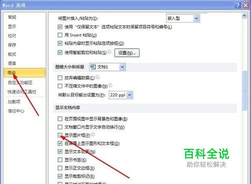 选择“高级”选项,取消选择“显示图片框”复选项。