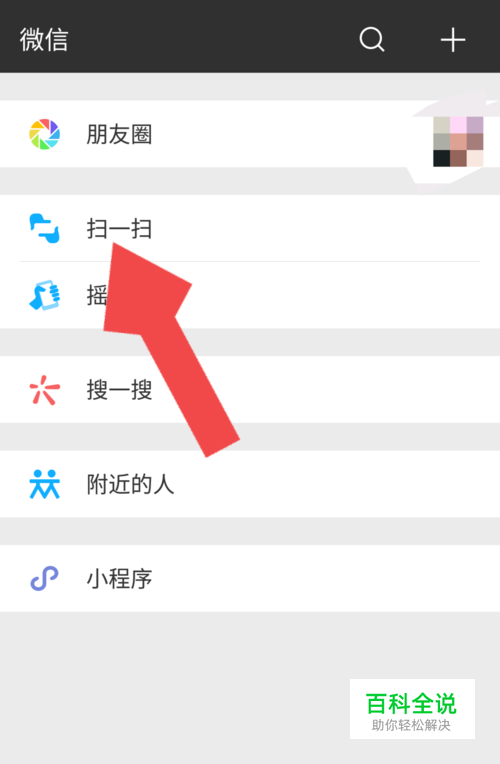 我们也可以在微信首页,点击页面右上角的“+”,在下属功能栏中点击“扫一扫”,进入微信的扫一扫页面。