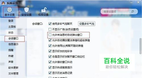 第三步:打开设置面板的基本设置页面,点击左边列表里的会话窗口设置,这时候右边的第三项就是“允许来消息时自动弹出窗口”,在左侧勾选上即可。