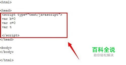 点击头标签<head>,在后面输入<script>标签,并且声明几个变量b、c、t。 <script type="text/javascript"> var b=0 var c=0 var t </script>