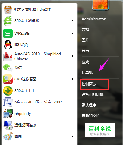2、在开始菜单栏中有个控制面板的选项,点击它。
