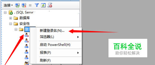 找到登录名,在这里是所有的用户列表,而我们要新建一个登录名,右键“新建“用户名即可。