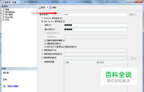 这里我们就可以新建用户了,输入帐号、密码,选择SQL身份验证。