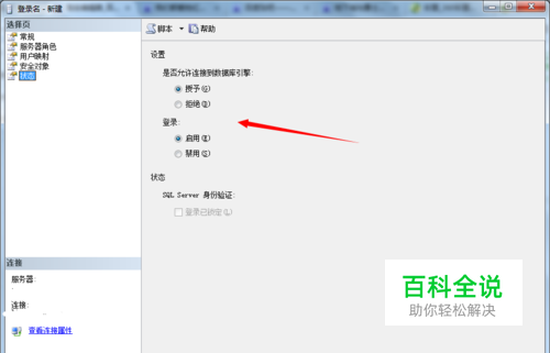 上一步我们只是设置了登录名和密码,但是却没有给它登录的权限。可以在安全选项卡里找到登录权限,启动即可。