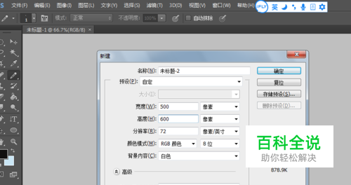 首先是新建一个文件,是500×600像素,分辨率为72的空白文件,