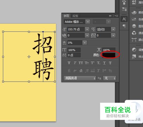 点击文字的工具,竖排工具,选择字体,为楷书,我们打上”招聘“两个字,字有点小,我们点击CTRL键,+t键然后拉动边框,字就可以随意大小,调整到我们认为合适的就可以了,颜色也可以调整,点击颜色,这里选择为黑色,,