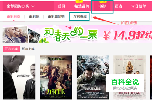 在线选座 登陆糯米团账号,点击团购类型【电影】--【在线选座】