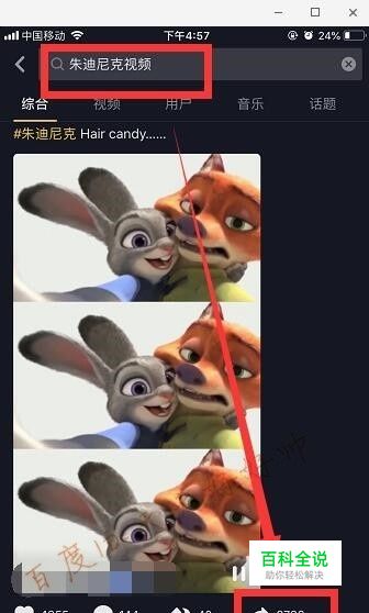 我们先用手机拍摄一段9秒的横屏视频,两张照片,然后根据音乐节奏将视频和 照片录屏,制作成一个视频,打开抖音,查找朱迪尼克视频,选择“分享”。