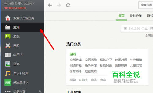 连接成功后,在软件左边的列表框里选择应用选项,也可以选择其他诸如游戏选项,这里选择应用是因为应用选项里能够搜索到平台里所有类型的软件。