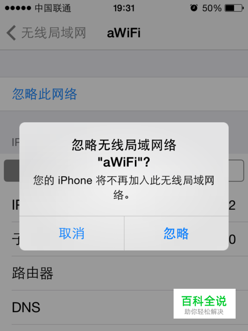 点击这个WiFi之后,就进入了这个WiFi的详细信息界面,在这个界面上你可以发现最上方有一个“忽略此网络”的选项。 用户点击这个选项。
