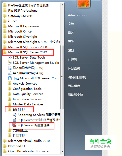 在开始程序中展开SQL2012—配置工具—SQL Server 配置管理器,双击打开SQL Server 配置管理器,如图: