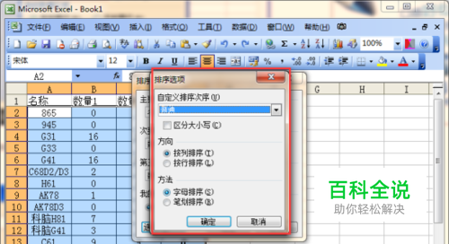 05、接着点击窗口中的“选项”按妞,在打开的排序窗口中,可以设置“按字母排序”和“笔划排序”,根据我们的实际情况进行选择。然后再点击“确定”按钮。如图所示;